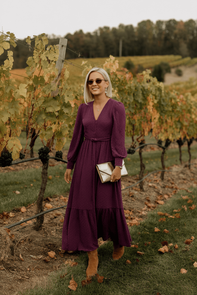 Wear a long-sleeve plum maxi with suede boots. Add a metallic clutch for contrast. It’s chic, cozy, and ready for those chilly late-night receptions.