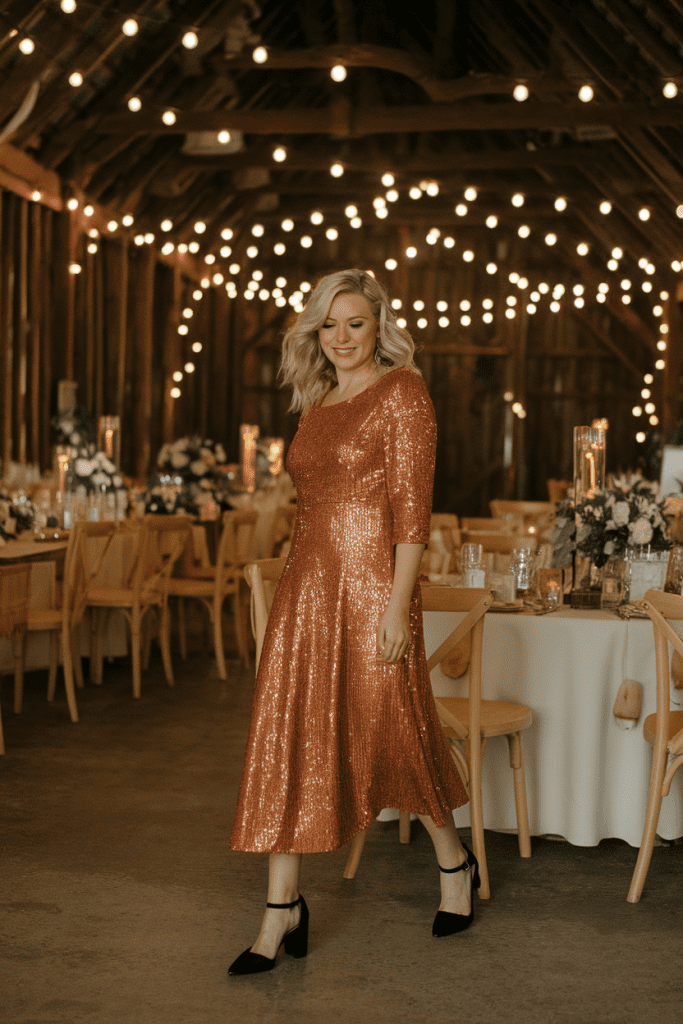 Pick a copper sequin midi with simple black heels. Keep jewelry minimal so the dress stays the star.