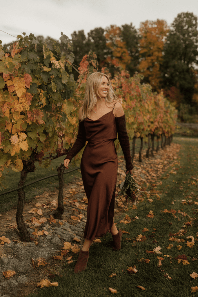 Style a chocolate satin slip dress with a cropped knit sweater layered over it. Add ankle boots for rustic charm.