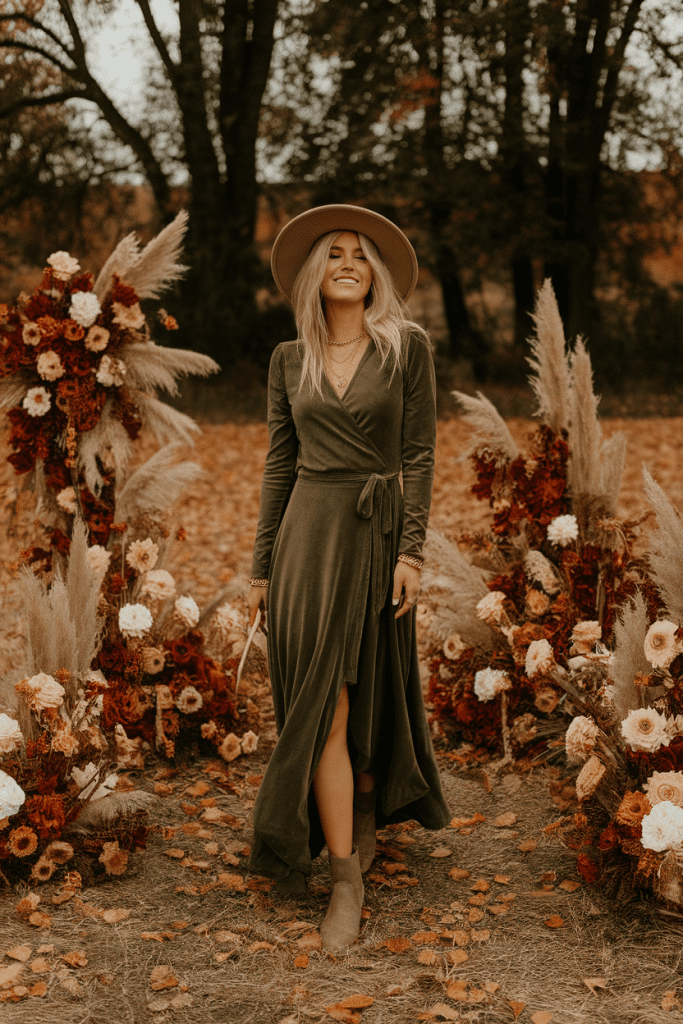 Wear an olive wrap dress with gold jewelry and ankle boots. The look feels grounded, chic, and seasonally perfect.