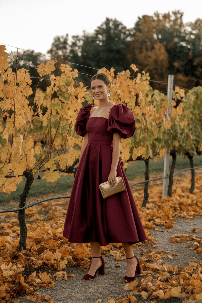 Try a burgundy midi with puff sleeves and block heels. Add a gold clutch and layered jewelry for an elevated look that feels wedding-ready but still wearable later for date night.