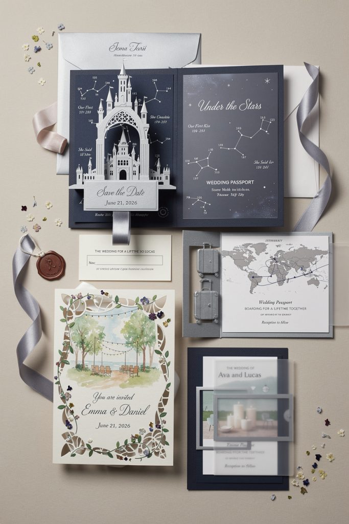 Your invitation opens and—bam—a tiny cathedral rises from the paper, kissed with a gleam of…
