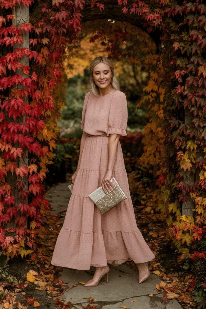 The best part? Autumn is basically begging for whimsical looks. The leaves are dramatic, the air is crisp, and golden-hour lighting turns every outfit into an editorial moment. A whimsical wedding guest dress doesn’t just look pretty — it makes you feel like the romantic heroine of your own cozy love story (even if you’re just here for the cake and dance floor).
