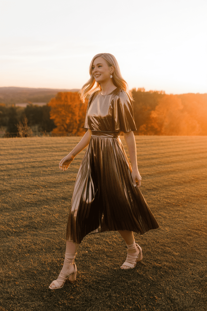 Whimsical doesn’t have to mean soft — sometimes shimmer is the romantic detail. A metallic pleated midi in bronze or rose gold glows against autumn light.