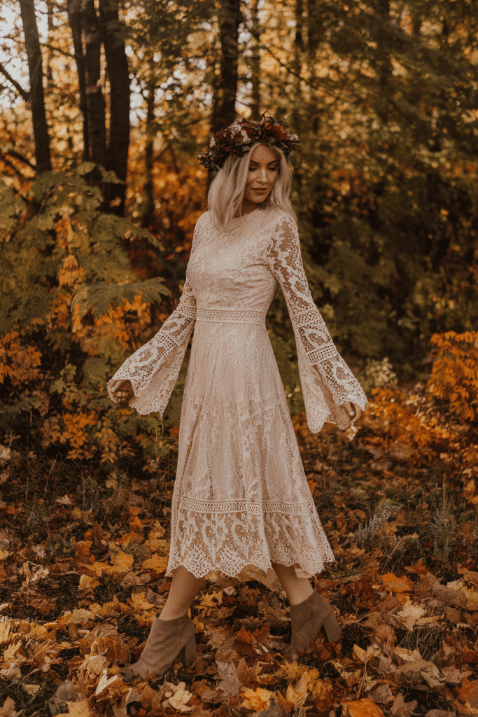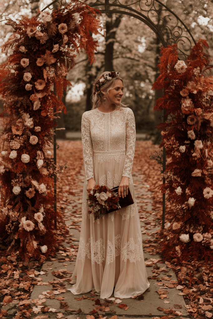 Let’s be honest: some people show up to fall weddings in sleek black gowns and tailored blazers, and that’s fine. But if you’re someone who thrives on dreamy, romantic style — think lace, flowy skirts, and details that feel a little magical — then whimsical fall wedding dresses are your vibe.