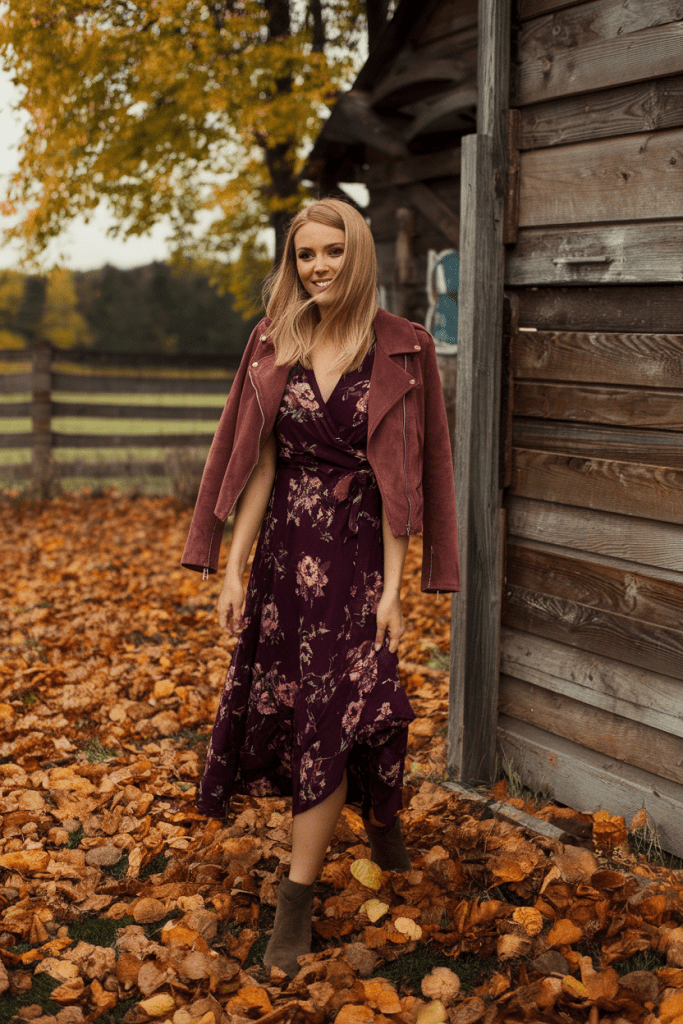 Florals can feel moody and romantic in fall when you choose darker prints — think plum, emerald, and burgundy patterns. A wrap silhouette keeps it flattering and comfortable.
