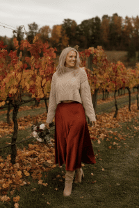 Chiffon is light, airy, and the perfect fabric for whimsical vibes. A midi in a warm fall shade like rust, olive, or mauve feels flowy without being fussy.